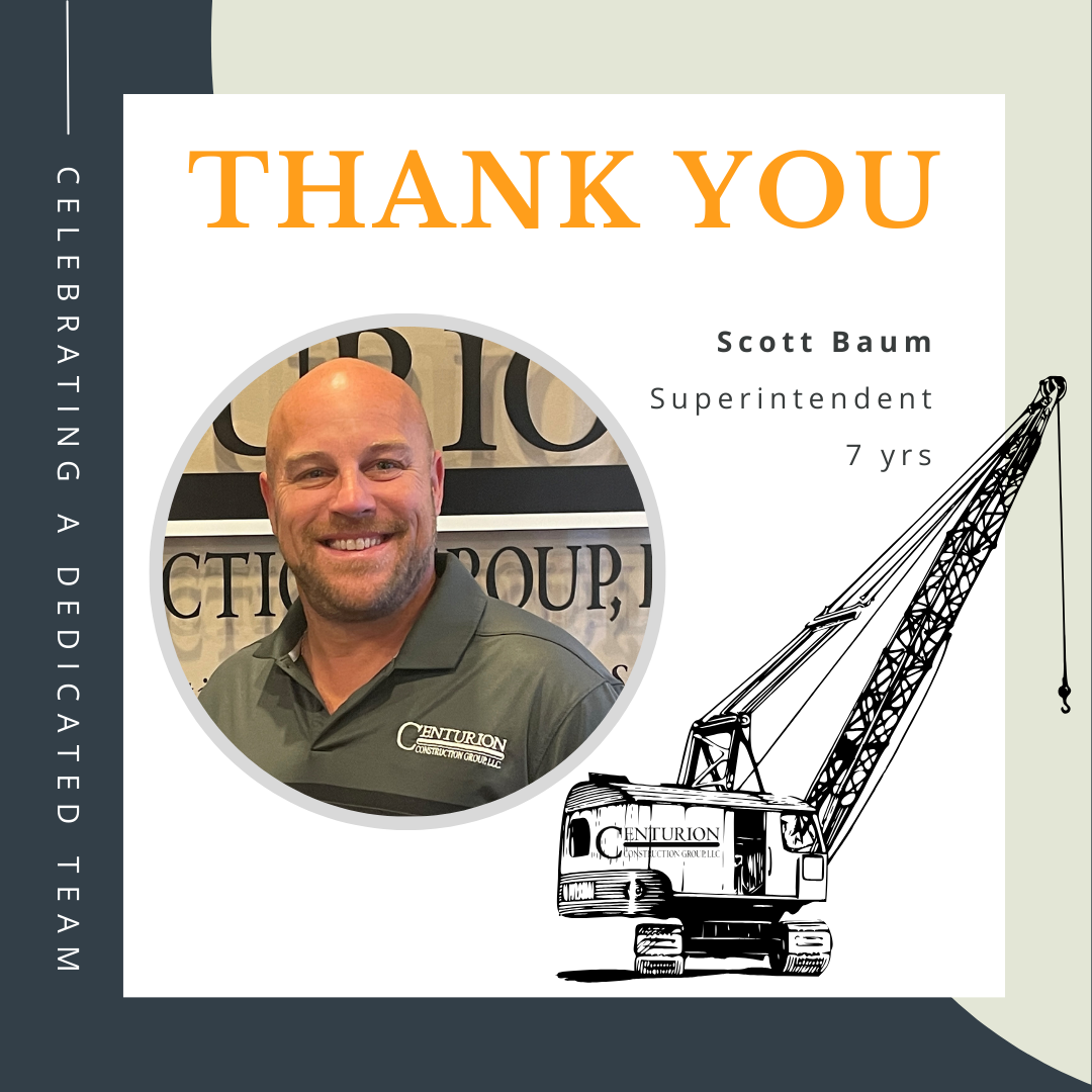 AUGUST ANNIVERSARY | Thank you Scott Baum, Superintendent for building excellence in all you do! We appreciate the ways in which you serve Centurion and it’s clients with purpose, integrity, and intention.