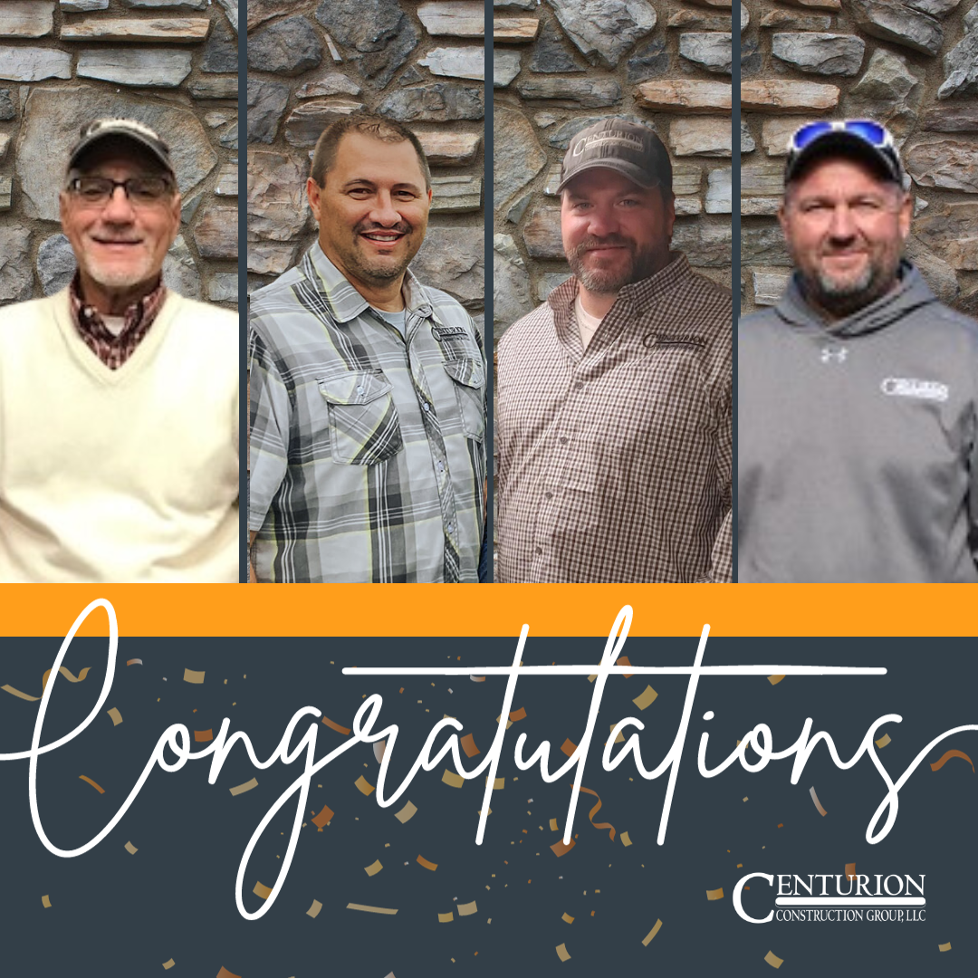 As we continue to grow, Centurion is pleased to announce the following employees and their new roles in leadership. Kevin Snoke, PE, Director of Operations, Troy Clark, Director of Small Projects, Ryan Schultz, Chief Estimator and Keith Dillon, General Superintendent. We would like to congratulate these individuals on their accomplishments.