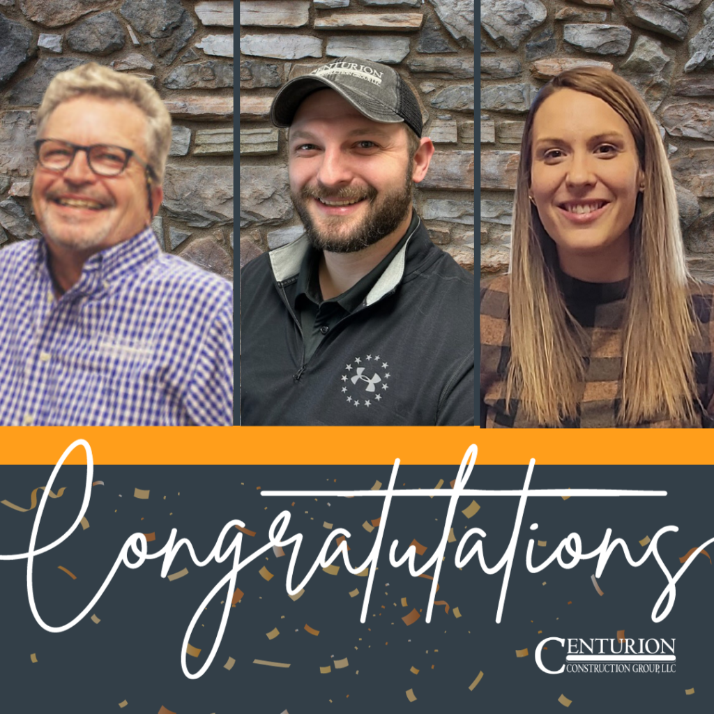 As we continue to grow, Centurion is pleased to announce the following employees and their new roles. David Olmsted, Pre-Construction Design, Luke Frymyer, Project Manager, and Christine Johnson, Communications. Let’s congratulate these individuals on their achievements.